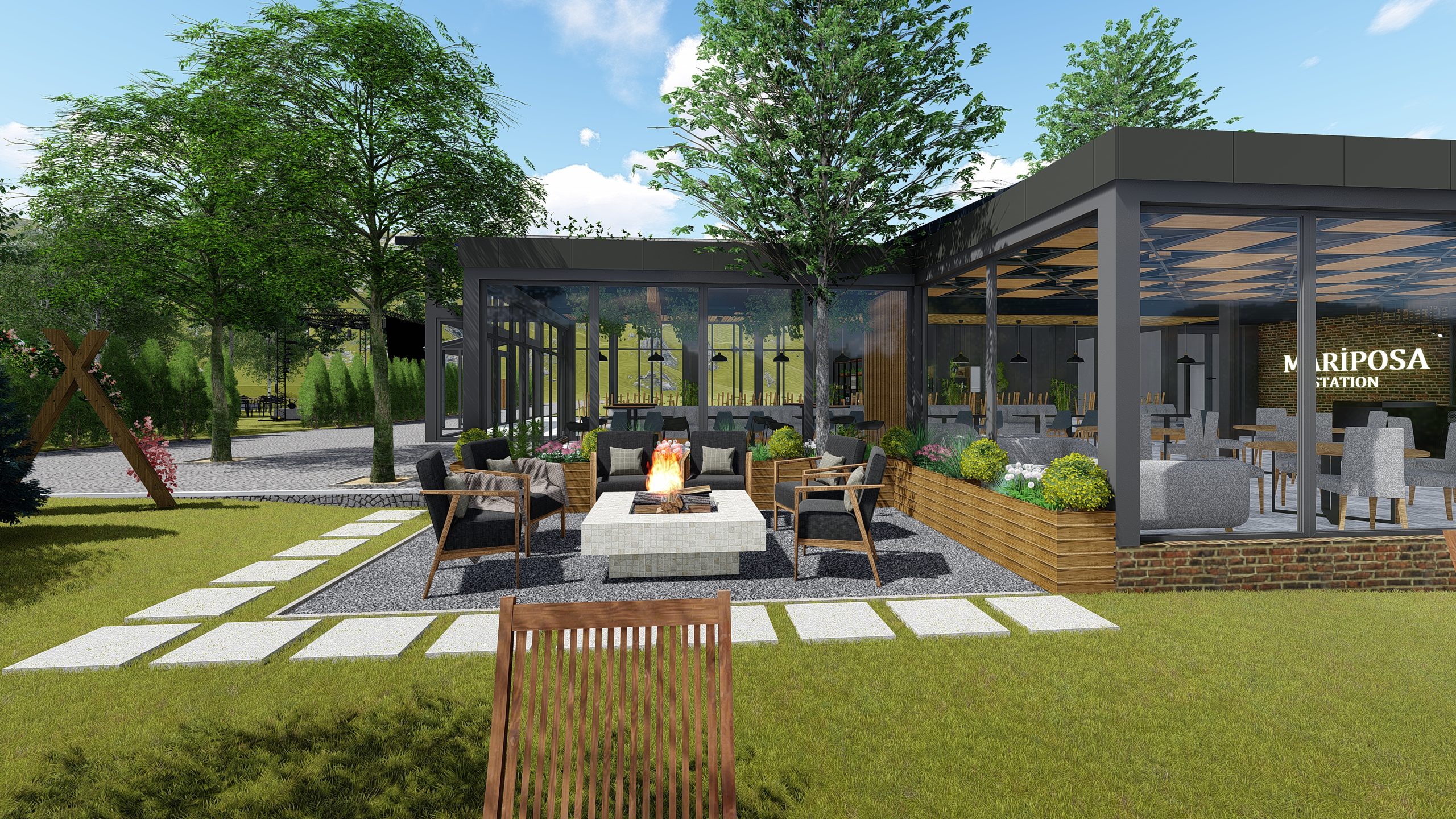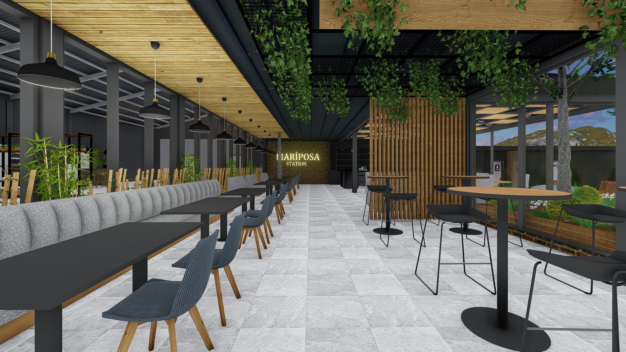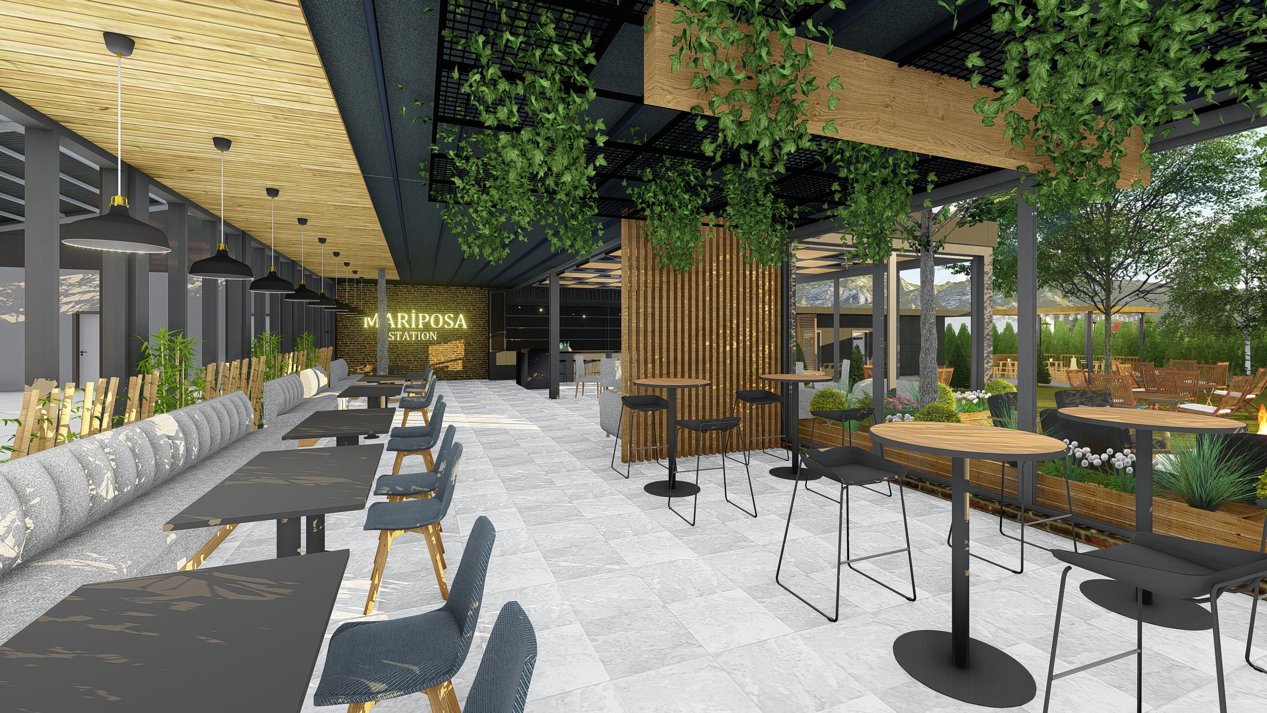 Mariposa Station Peyzaj Tasarımı Projesi, doğa ile iç içe, rahatlatıcı ve estetik açıdan tatmin edici bir kafe deneyimi sunmak üzere tasarlanmıştır.